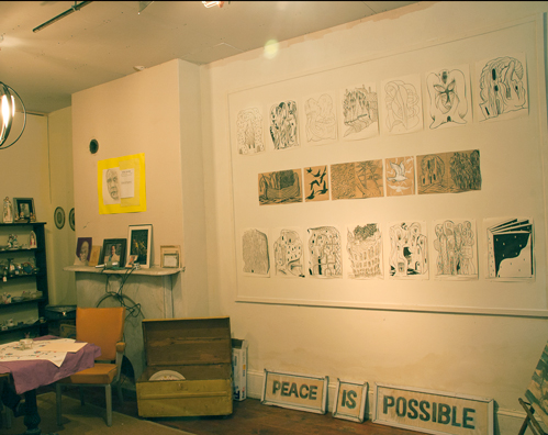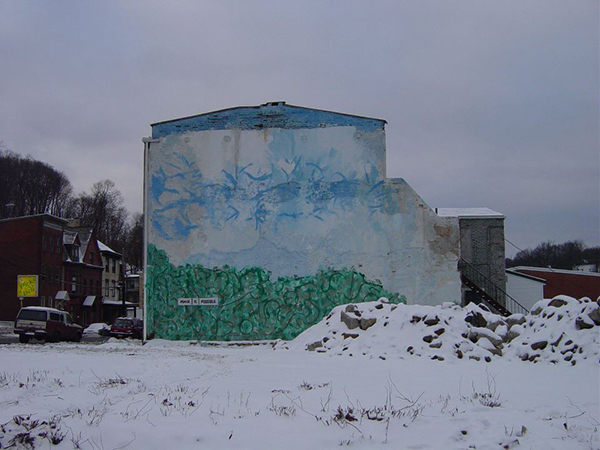 Large piece in the main first floor gallery. On the floor, leaning against the wall is the title for the mural "Peace Is Possible" which Dave Johnson painted on the side of the Pottsville Museum. See below.