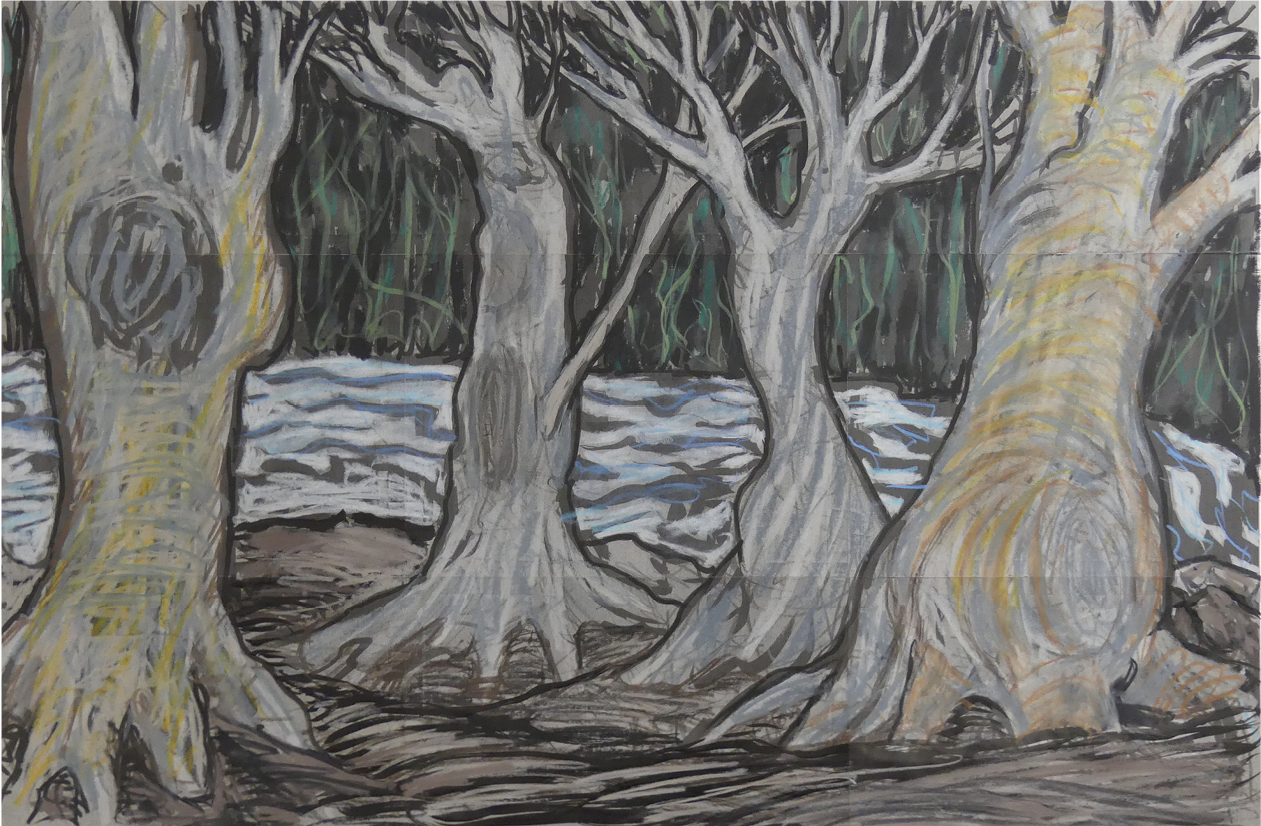 four trees by a stream 28" x 18.5" wax pastel on printouts