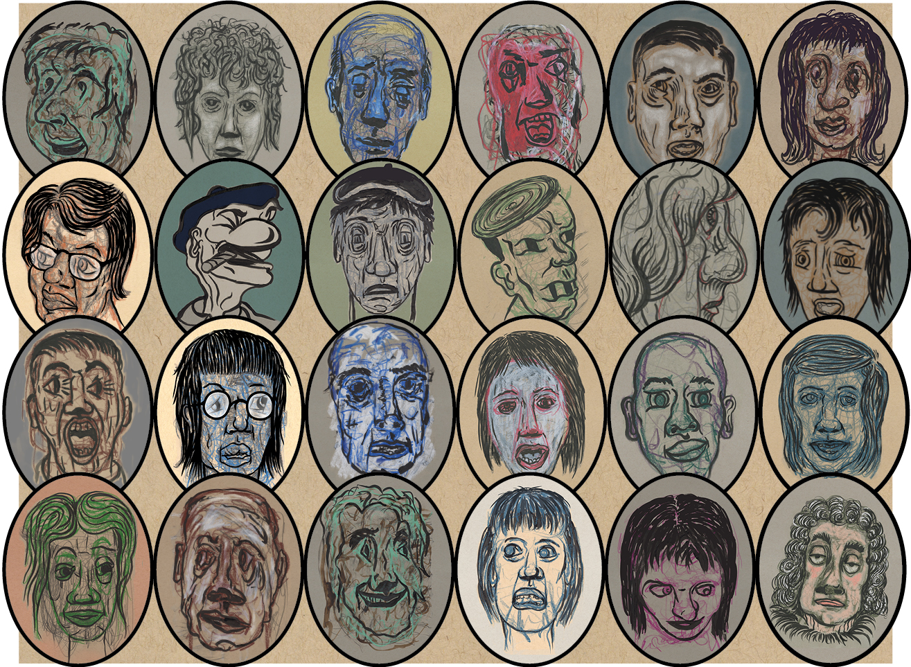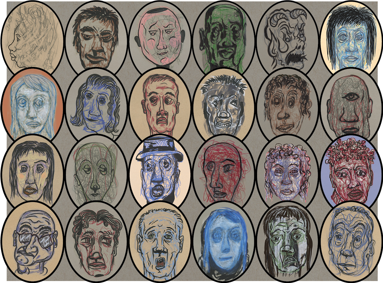 portraits from sketchbooks pencil, wax pastel, ink